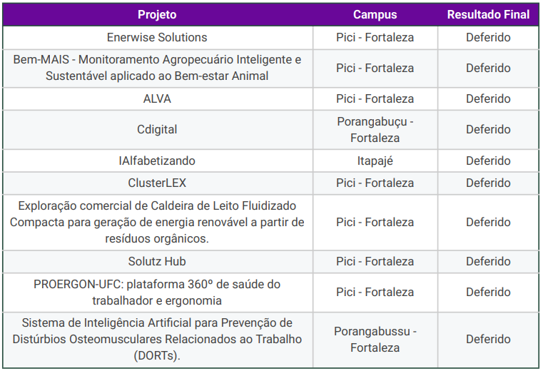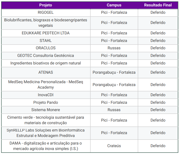 Data da publicação: 12 de setembro de 2025 Categoria: Notícias mais recentesO Partec/UFC anuncia o resultado final da análise prévia das propostas para o programa de desenvolvimento de startups. A seleção, conforme o Item 7 dos Editais de Incubação e de Pré-incubação (Nº 01/2025 e Nº 02/2025), após avaliação dos recursos, determinou os projetos que avançam para a segunda fase do processo seletivo.
