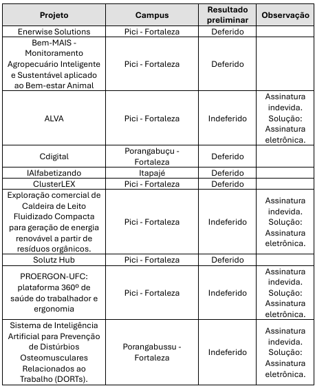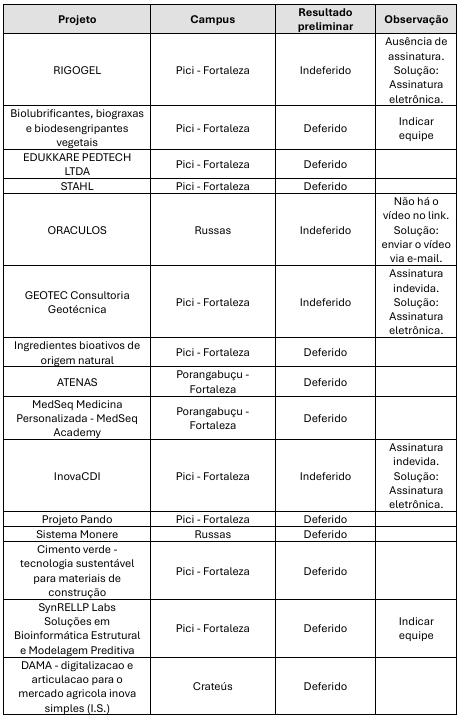 Importante destacar que os pedidos de recurso da primeira fase dos editais de incubação e pré-incubação podem ser realizados até o dia 11/09/2025 (quinta-feira). Os motivos para o indeferimento estão especificados na coluna de observação da tabela acima.